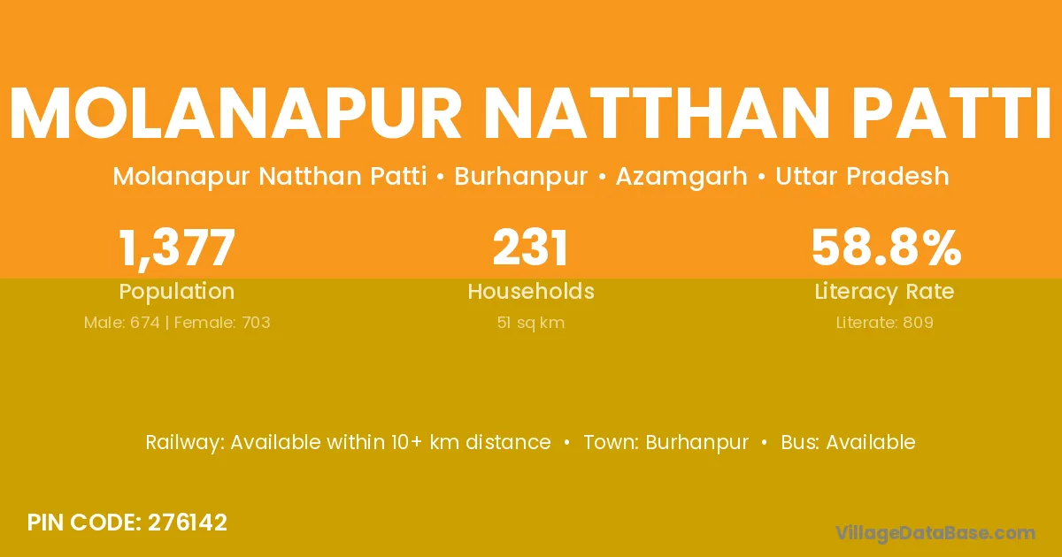 Molanapur Natthan Patti village has a total population of 1,377 people, of which 674 are males and 703 are females.
