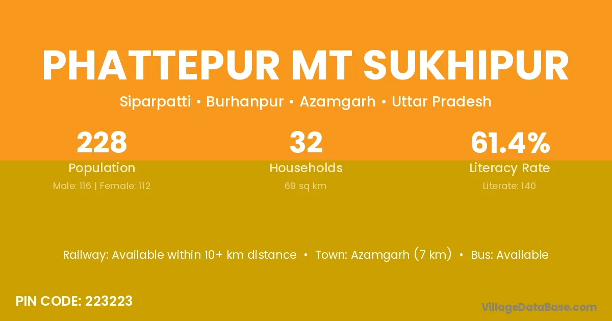 Phattepur Mt Sukhipur village has a total population of 228 people, of which 116 are males and 112 are females.