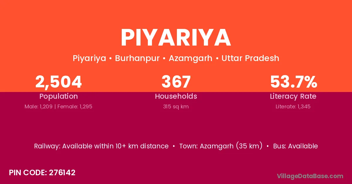 Azamgarh (35 km) is the nearest town to Piyariya village for major economic activities and is located approximately 35 km away.