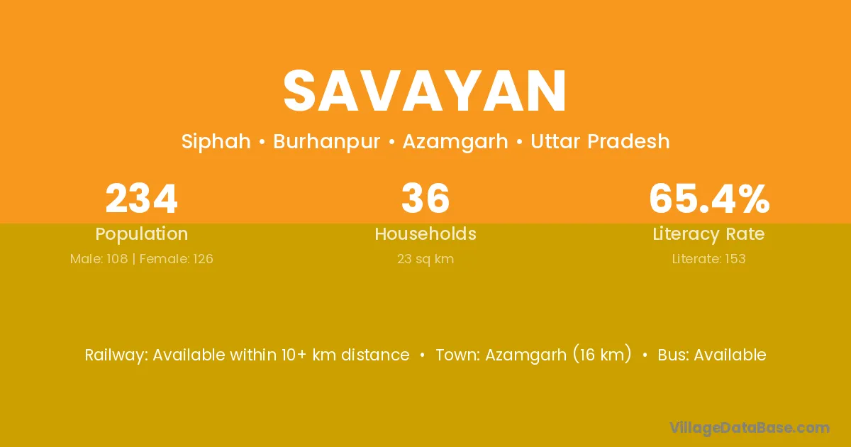 Azamgarh (16 km) is the nearest town to Savayan village for major economic activities and is located approximately 16 km away.