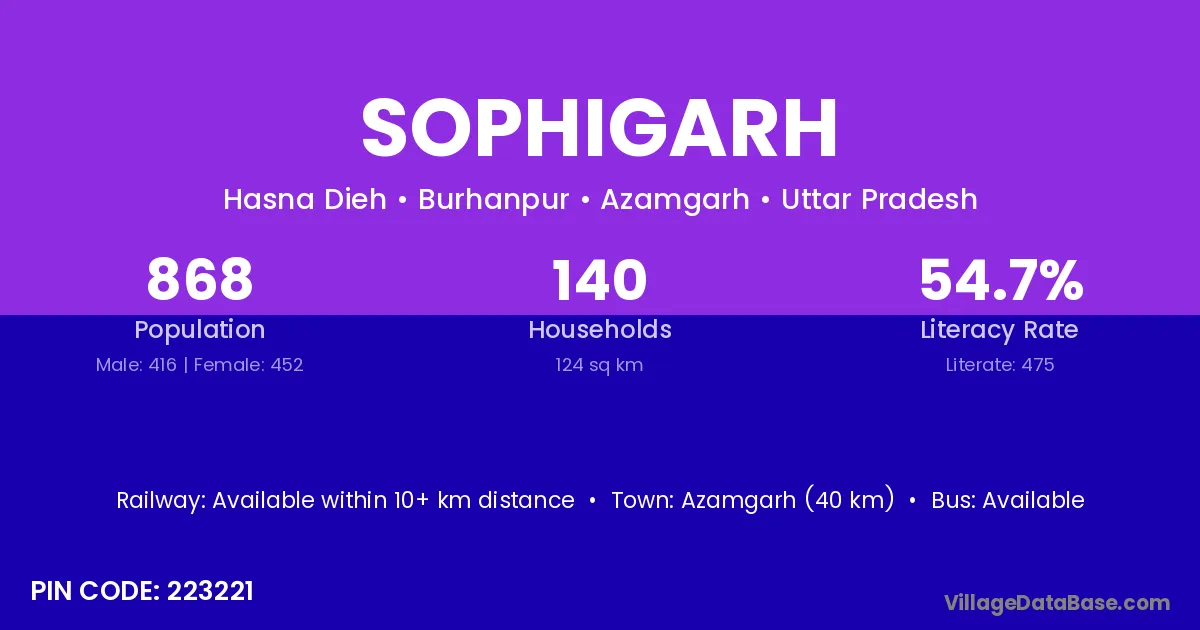 Azamgarh (40 km) is the nearest town to Sophigarh village for major economic activities and is located approximately 40 km away.