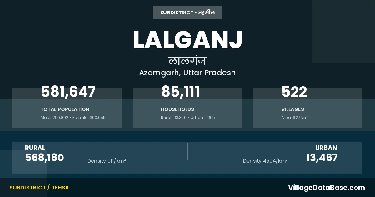 According to the 2011 census The total area of Lalganj Tehsil is 627 km², with a population of 581647 people. The population density is 928 inhabitants per square kilometre, and there are approximately 85111 houses in the sub district.