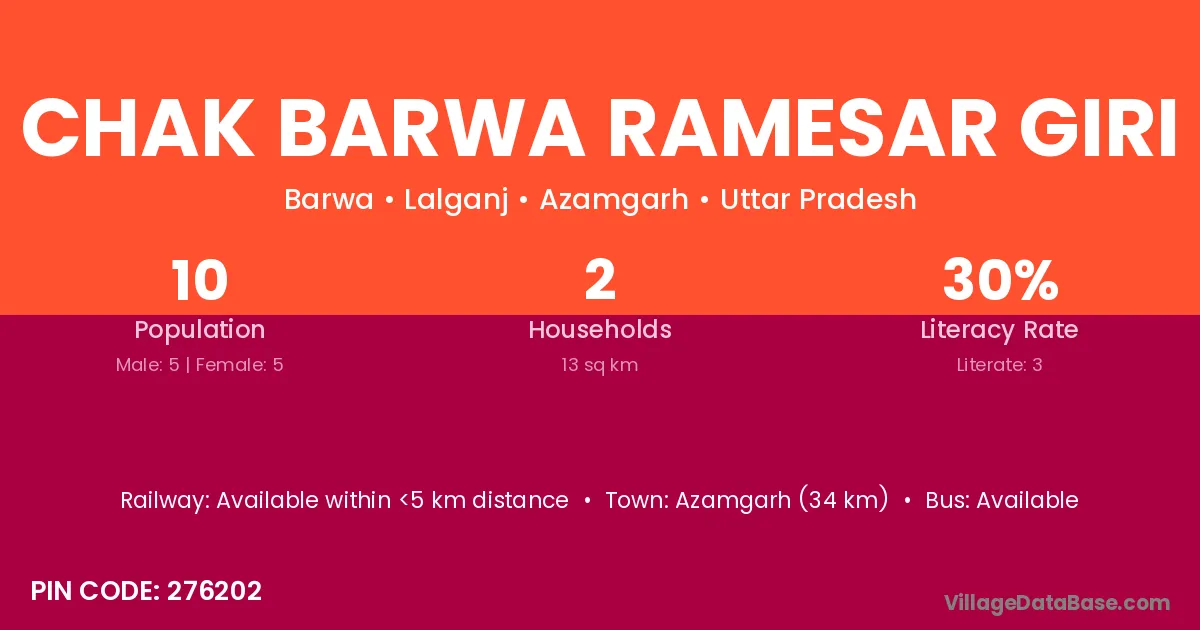Chak Barwa Ramesar Giri village has a total population of 10 people, of which 5 are males and 5 are females.