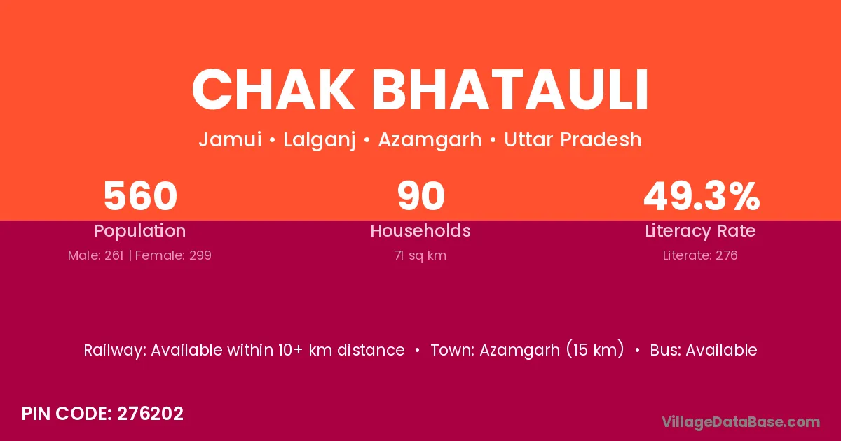 Azamgarh (15 km) is the nearest town to Chak Bhatauli village for major economic activities and is located approximately 15 km away.
