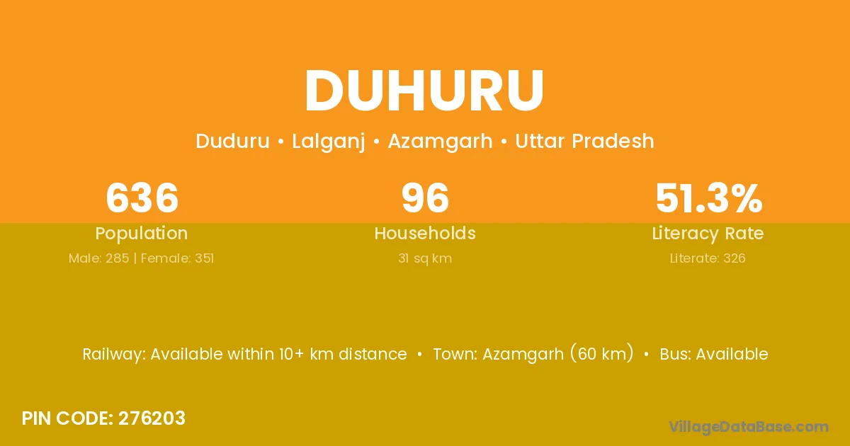 Azamgarh (60 km) is the nearest town to Duhuru village for major economic activities and is located approximately 60 km away.