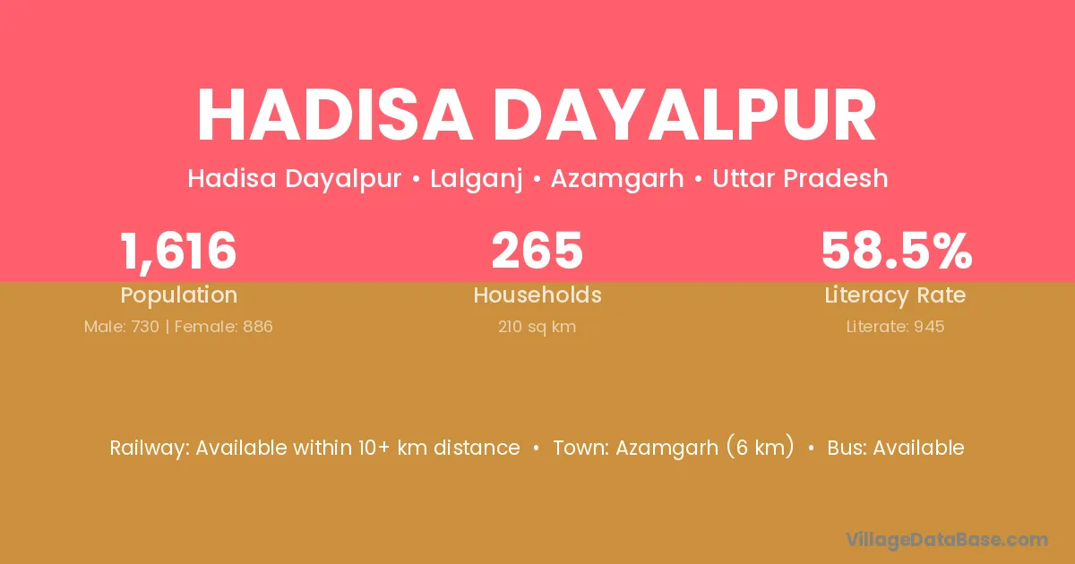 Azamgarh (6 km) is the nearest town to Hadisa Dayalpur village for major economic activities and is located approximately 6 km away.