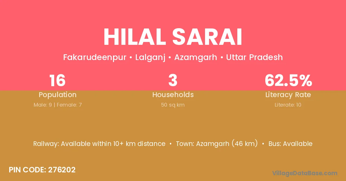 Azamgarh (46 km) is the nearest town to Hilal Sarai village for major economic activities and is located approximately 46 km away.