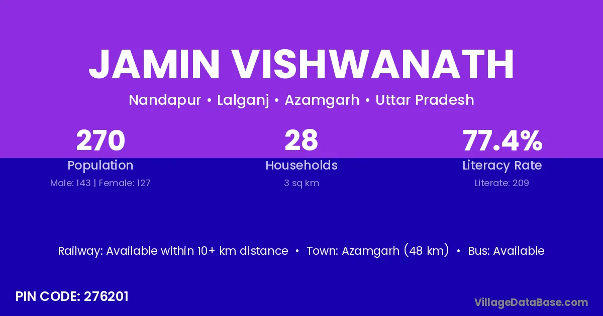 Azamgarh (48 km) is the nearest town to Jamin Vishwanath village for major economic activities and is located approximately 48 km away.
