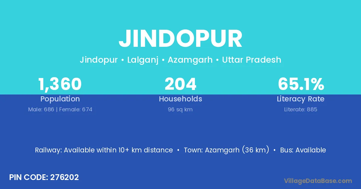 Azamgarh (36 km) is the nearest town to Jindopur village for major economic activities and is located approximately 36 km away.