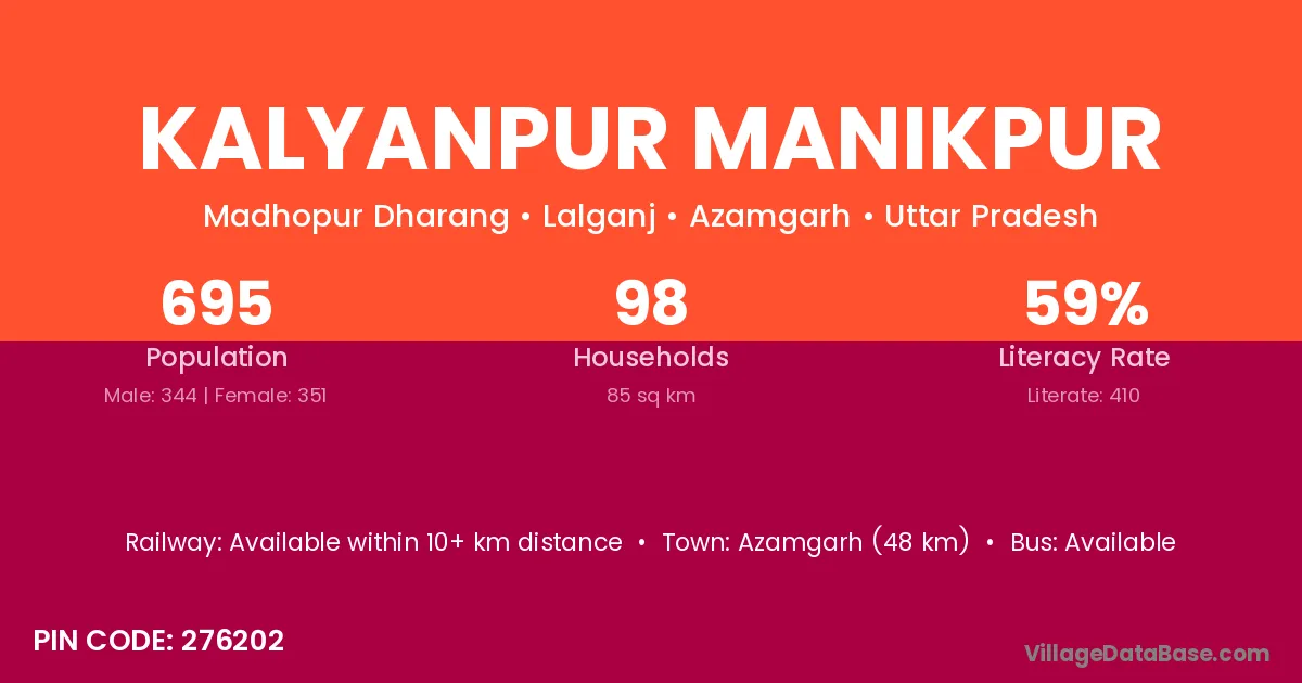 Azamgarh (48 km) is the nearest town to Kalyanpur Manikpur village for major economic activities and is located approximately 48 km away.