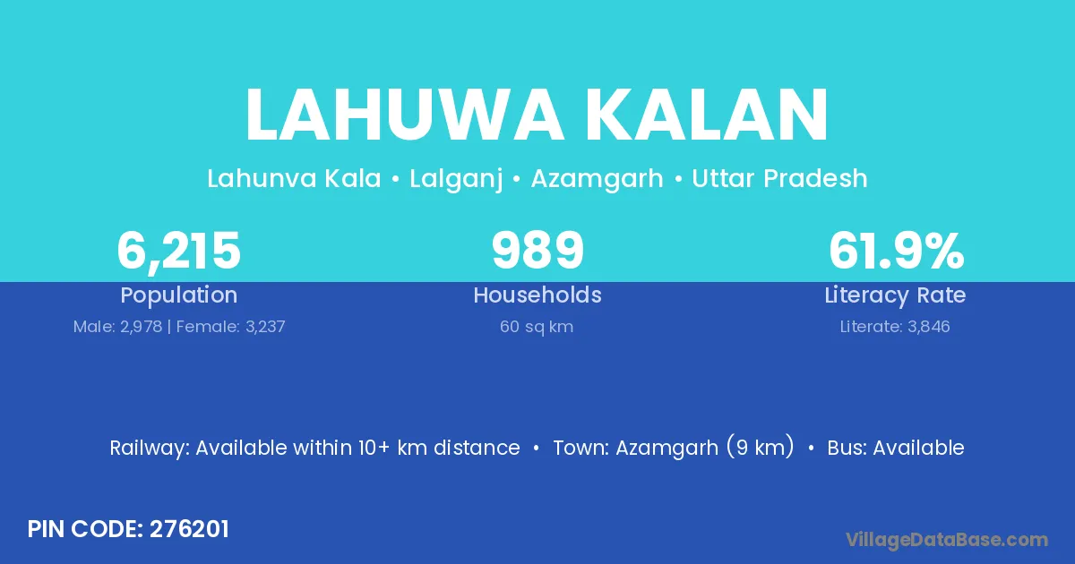 Azamgarh (9 km) is the nearest town to Lahuwa Kalan village for major economic activities and is located approximately 9 km away.