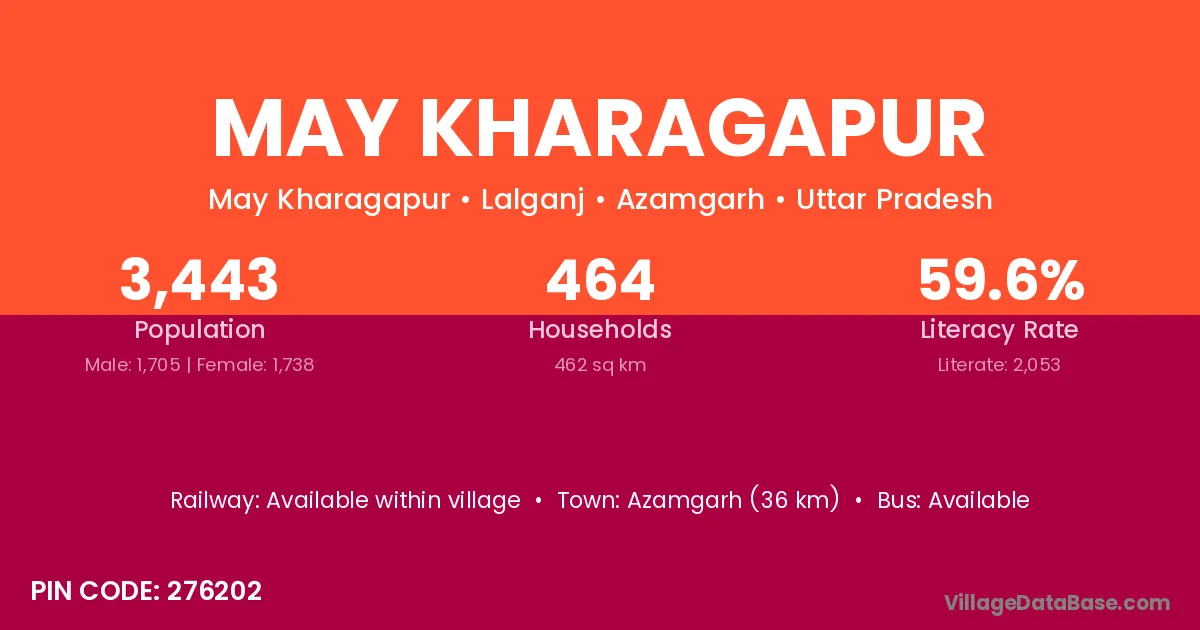 Azamgarh (36 km) is the nearest town to May Kharagapur village for major economic activities and is located approximately 36 km away.