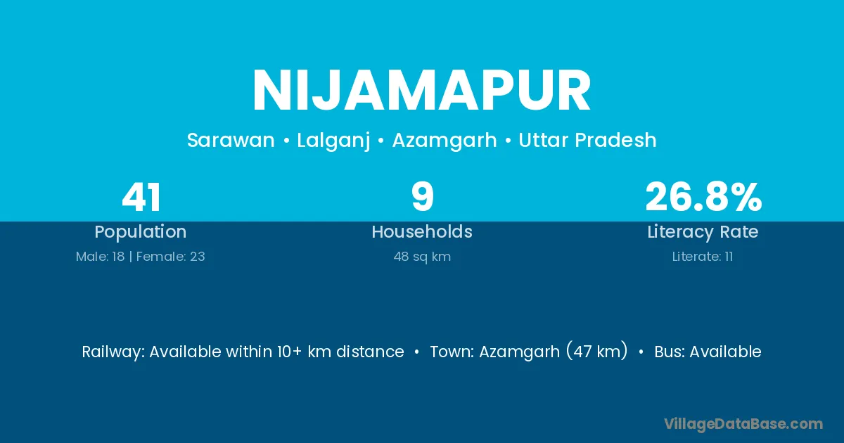 Azamgarh (47 km) is the nearest town to Nijamapur village for major economic activities and is located approximately 47 km away.