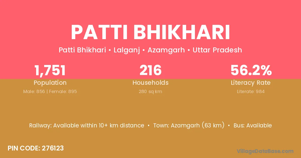 Azamgarh (63 km) is the nearest town to Patti Bhikhari village for major economic activities and is located approximately 63 km away.