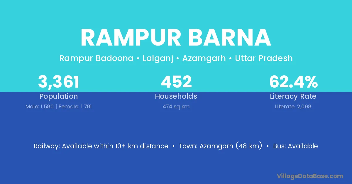Azamgarh (48 km) is the nearest town to Rampur Barna village for major economic activities and is located approximately 48 km away.