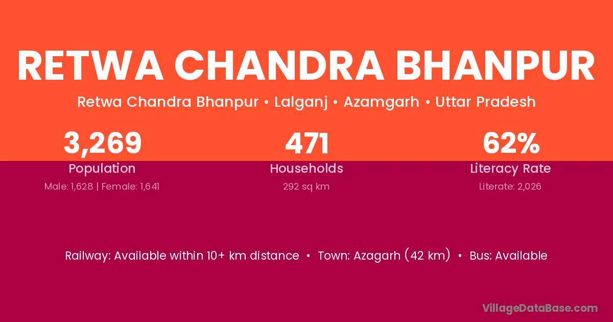 Azagarh (42 km) is the nearest town to Retwa Chandra Bhanpur village for major economic activities and is located approximately 42 km away.