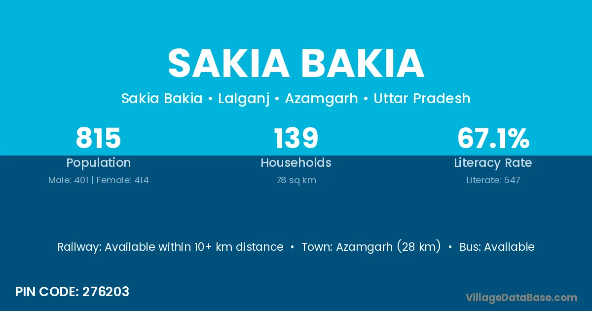 Azamgarh (28 km) is the nearest town to Sakia Bakia village for major economic activities and is located approximately 28 km away.