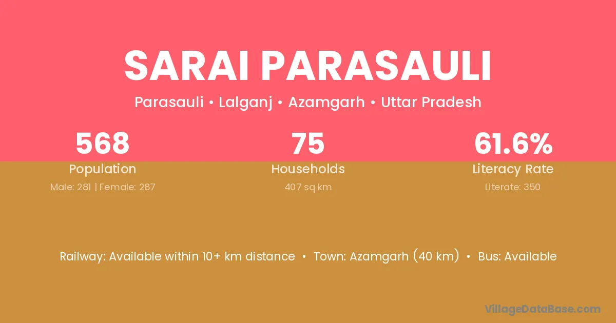 Azamgarh (40 km) is the nearest town to Sarai Parasauli village for major economic activities and is located approximately 40 km away.