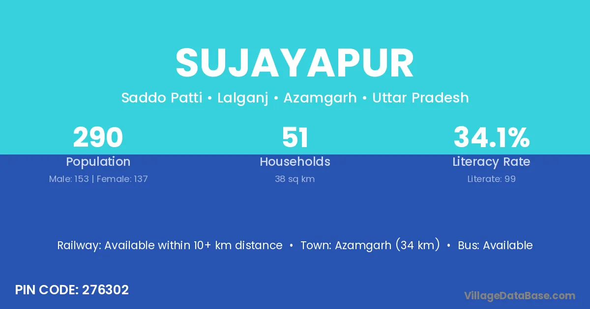 Azamgarh (34 km) is the nearest town to Sujayapur village for major economic activities and is located approximately 34 km away.