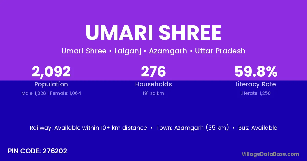 Azamgarh (35 km) is the nearest town to Umari Shree village for major economic activities and is located approximately 35 km away.