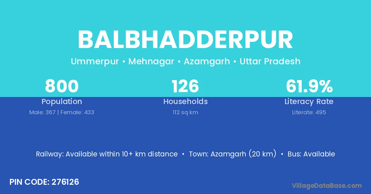 Azamgarh (20 km) is the nearest town to Balbhadderpur village for major economic activities and is located approximately 20 km away.