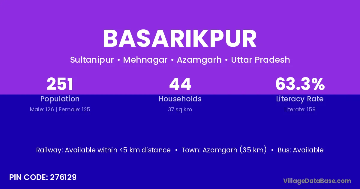 Azamgarh (35 km) is the nearest town to Basarikpur village for major economic activities and is located approximately 35 km away.