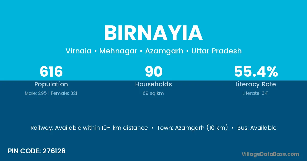 Azamgarh (10 km) is the nearest town to Birnayia village for major economic activities and is located approximately 10 km away.