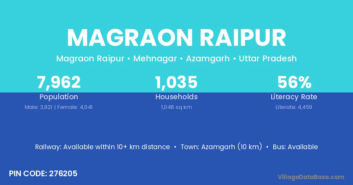 Azamgarh (10 km) is the nearest town to Magraon Raipur village for major economic activities and is located approximately 10 km away.