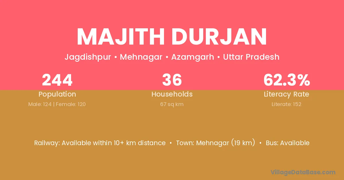 Mehnagar (19 km) is the nearest town to Majith Durjan village for major economic activities and is located approximately 19 km away.
