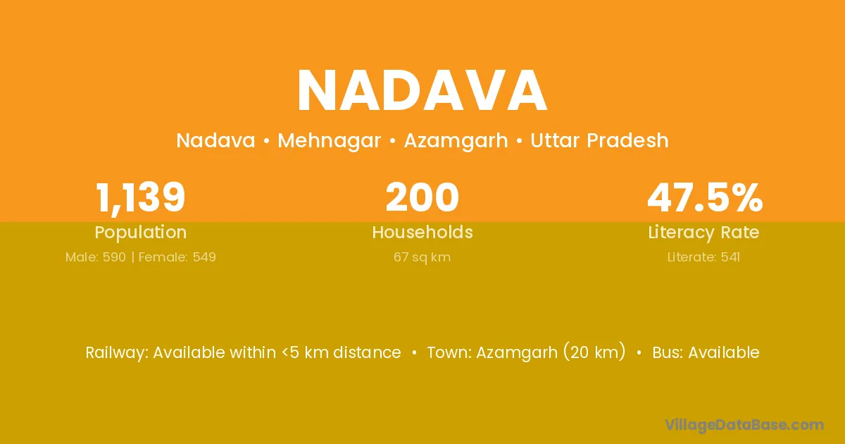 Azamgarh (20 km) is the nearest town to Nadava village for major economic activities and is located approximately 20 km away.
