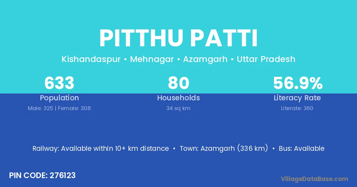 Azamgarh (336 km) is the nearest town to Pitthu Patti village for major economic activities and is located approximately 336 km away.