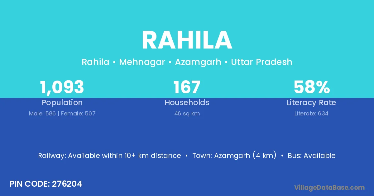 Azamgarh (4 km) is the nearest town to Rahila village for major economic activities and is located approximately 4 km away.