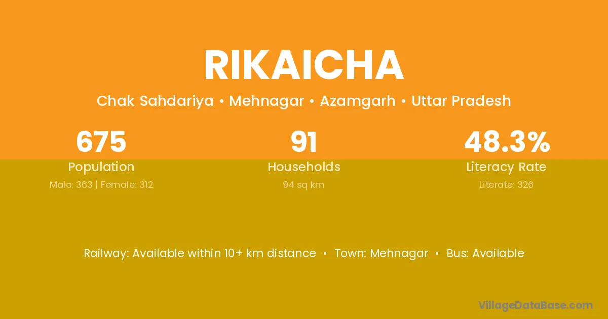Rikaicha village has a total population of 675 people, of which 363 are males and 312 are females.