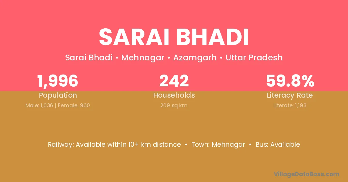 Sarai Bhadi village has a total population of 1,996 people, of which 1,036 are males and 960 are females.