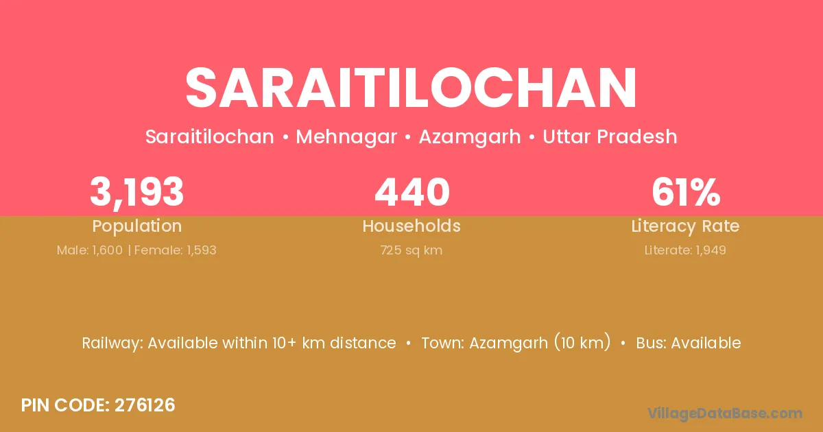 Azamgarh (10 km) is the nearest town to Saraitilochan village for major economic activities and is located approximately 10 km away.