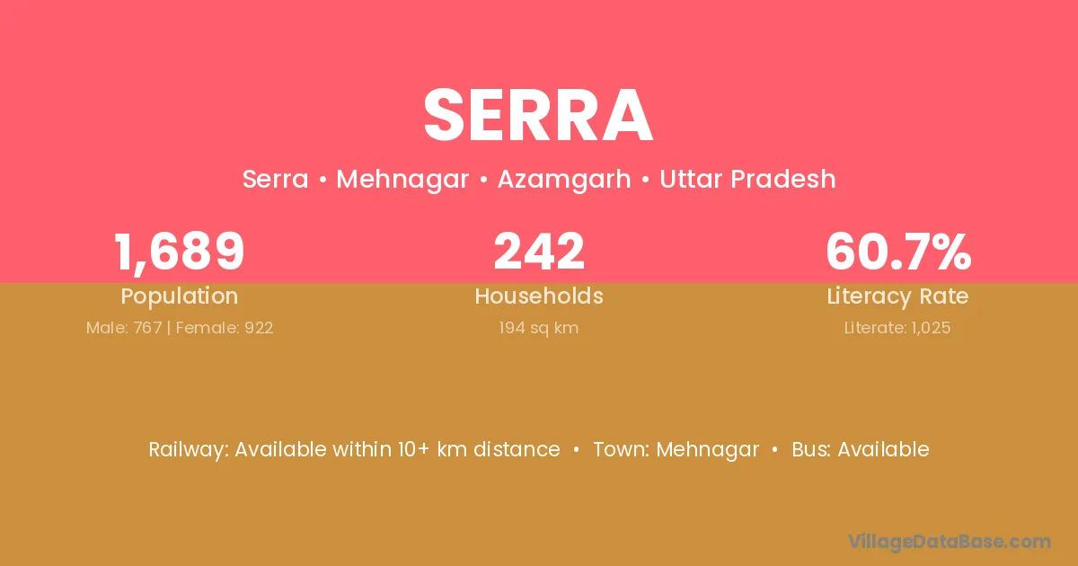 Serra village has a total population of 1,689 people, of which 767 are males and 922 are females.