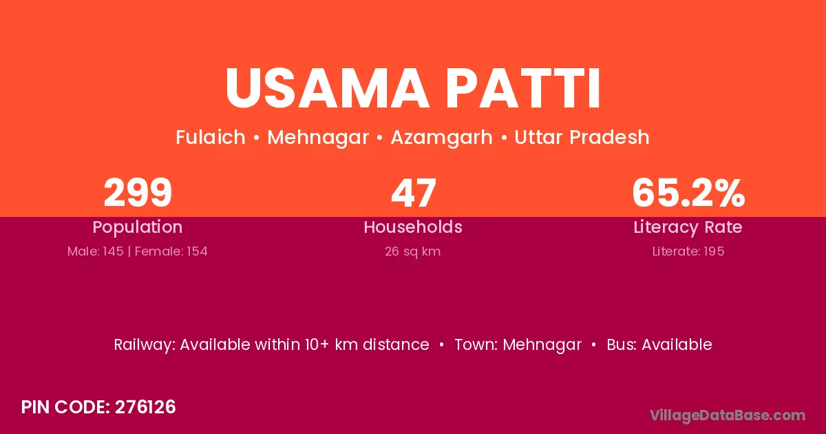 Usama Patti village has a total population of 299 people, of which 145 are males and 154 are females.