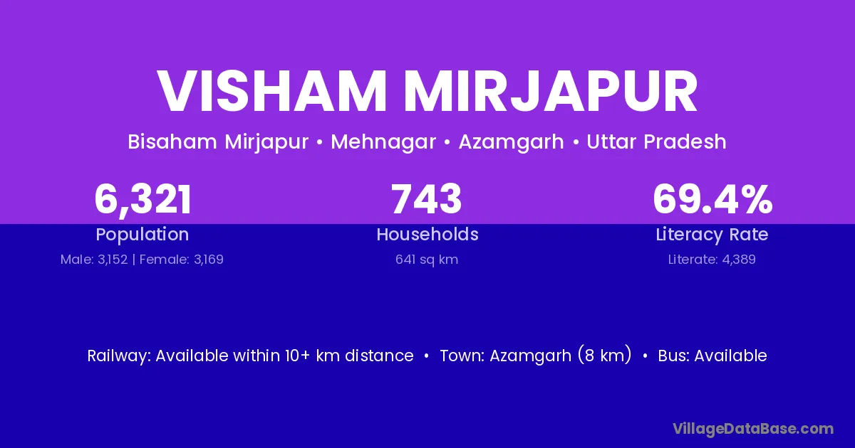 Azamgarh (8 km) is the nearest town to Visham Mirjapur village for major economic activities and is located approximately 8 km away.