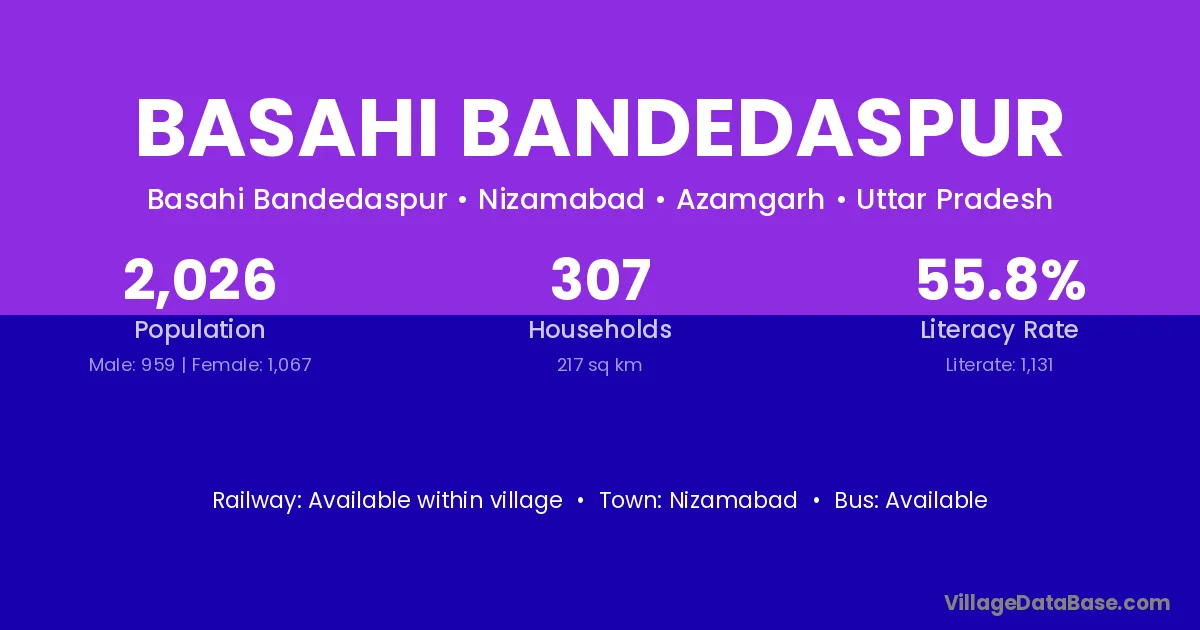 Basahi Bandedaspur village has a total population of 2,026 people, of which 959 are males and 1,067 are females.