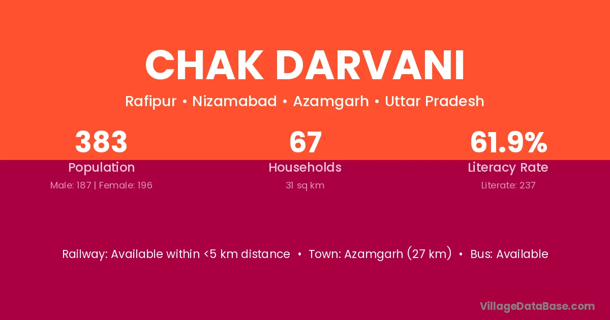 Azamgarh (27 km) is the nearest town to Chak Darvani village for major economic activities and is located approximately 27 km away.