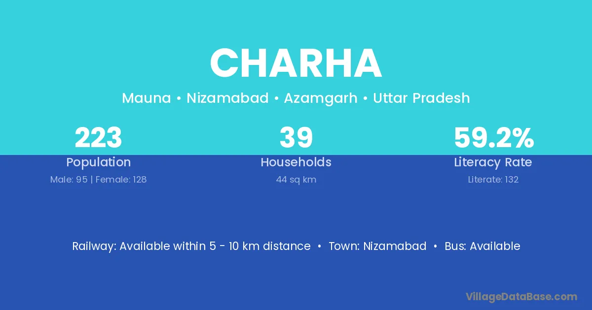 Charha village has a total population of 223 people, of which 95 are males and 128 are females.