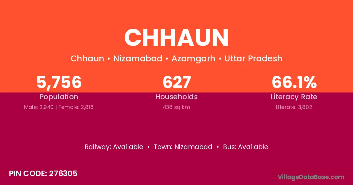 Chhaun village has a total population of 5,756 people, of which 2,940 are males and 2,816 are females.