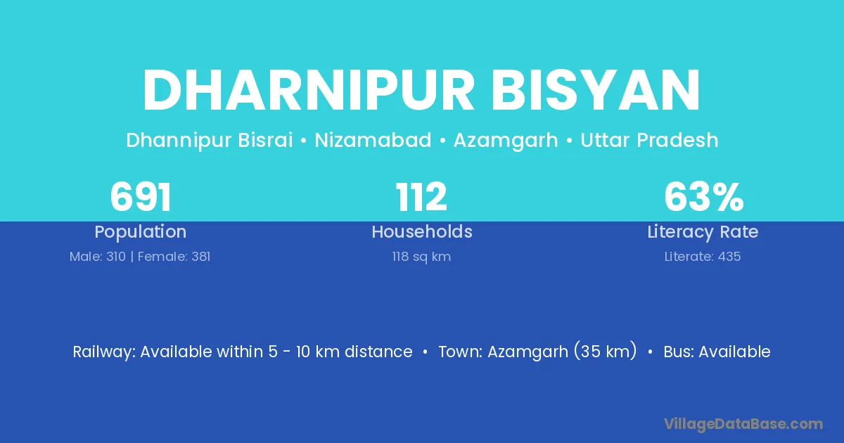 Azamgarh (35 km) is the nearest town to Dharnipur Bisyan village for major economic activities and is located approximately 35 km away.