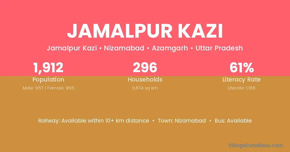 Jamalpur Kazi village has a total population of 1,912 people, of which 957 are males and 955 are females.
