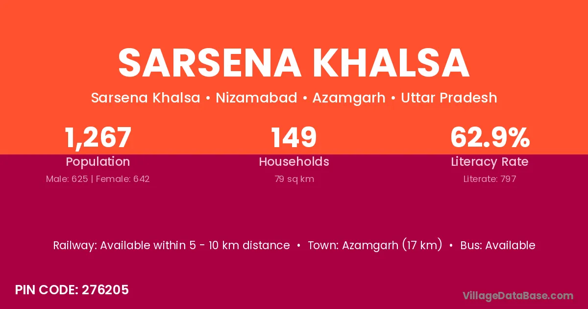 Azamgarh (17 km) is the nearest town to Sarsena Khalsa village for major economic activities and is located approximately 17 km away.