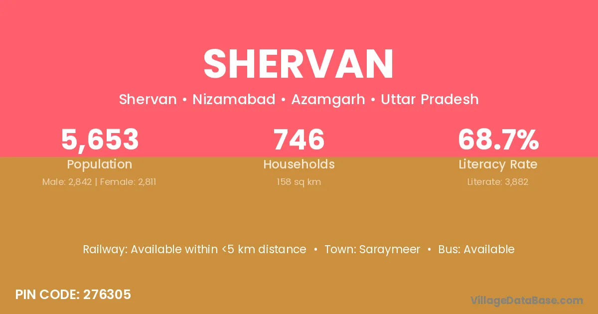 Shervan village has a total population of 5,653 people, of which 2,842 are males and 2,811 are females.