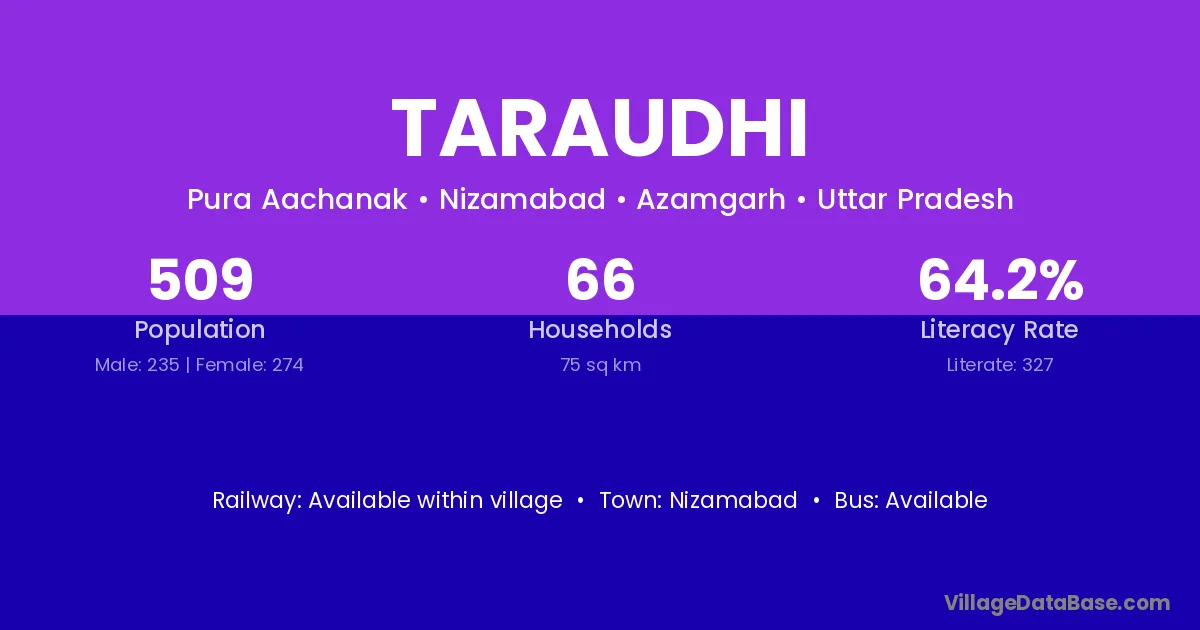Taraudhi village has a total population of 509 people, of which 235 are males and 274 are females.