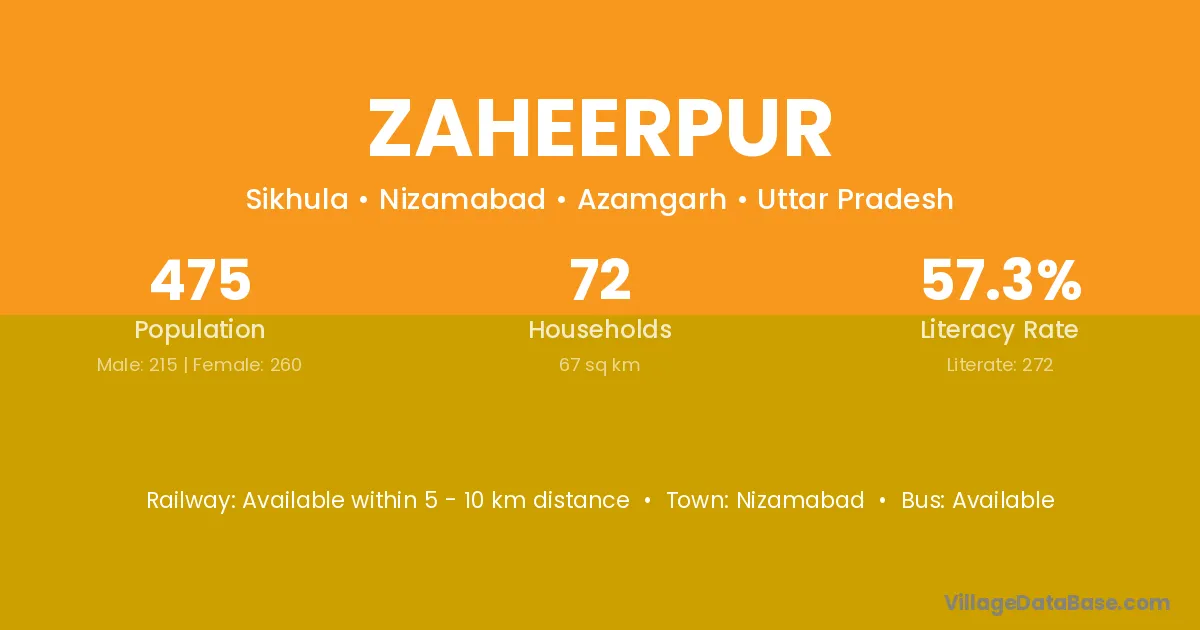 Zaheerpur village has a total population of 475 people, of which 215 are males and 260 are females.