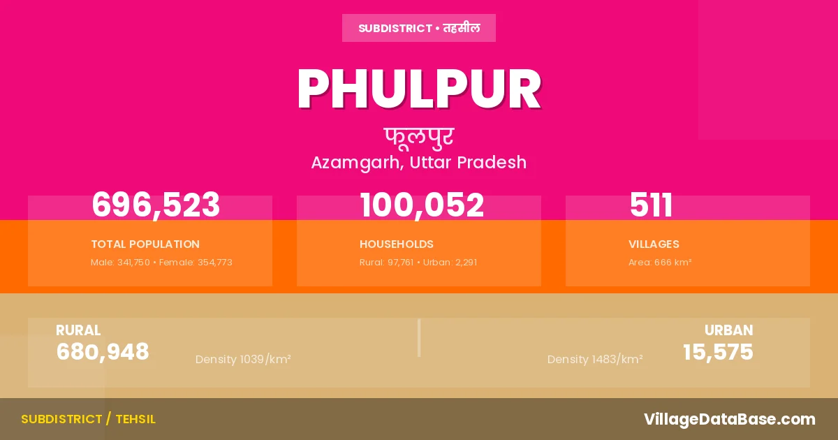 According to the 2011 census The total area of Phulpur Tehsil is 666 km², with a population of 696523 people. The population density is 1,046 inhabitants per square kilometre, and there are approximately 100052 houses in the sub district.