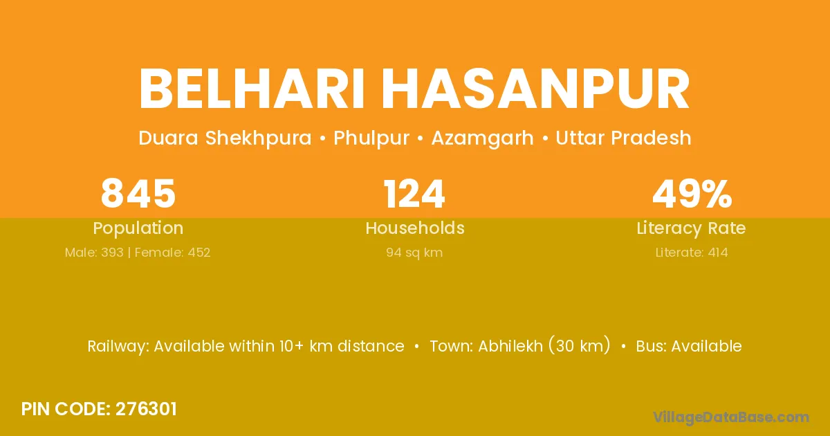 Abhilekh (30 km) is the nearest town to Belhari Hasanpur village for major economic activities and is located approximately 30 km away.